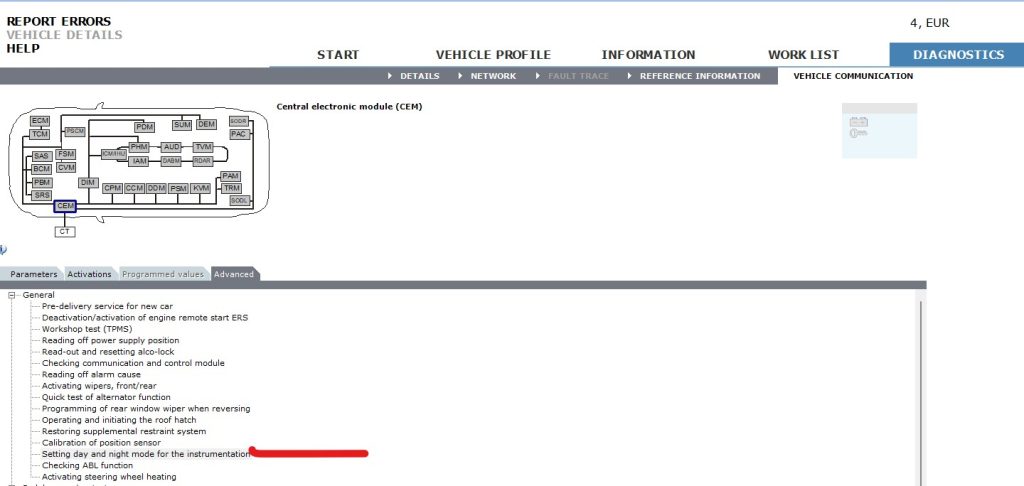 In Vida go to Diagnostics, Vehicle communication, CEM , Advanced and look for “Setting Day and night mode for the instrumentation”, double click it and Choose “More night mode”.